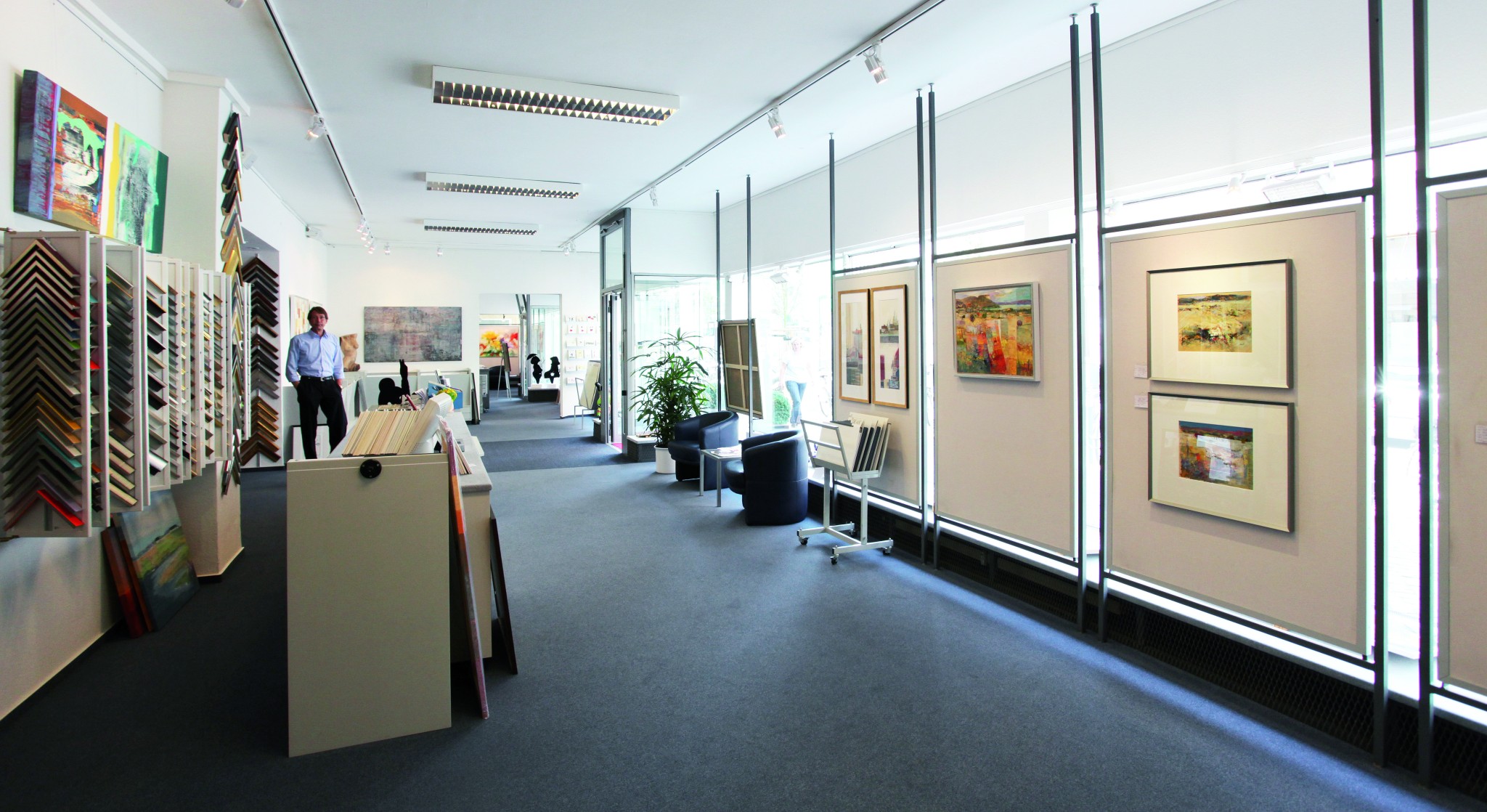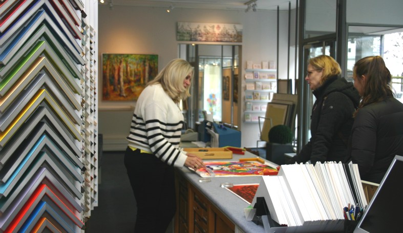 Für die individuelle Einrahmung neuer und eigener Kunstwerke haben Sie die Auswahl aus über tausend Leisten, die in der eigenen Rahmenwerkstatt verarbeitet werden.