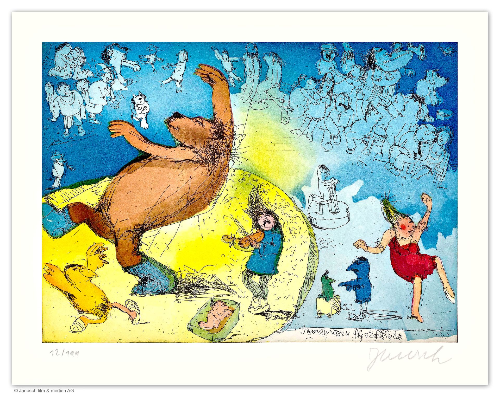 Mit seinen selbst illustrierten Kinderbüchern ist Janosch weltberühmt geworden. Immer wieder hat er neue Charaktere entworfen, die er gekonnt in Szene setzt. Seine Figuren wie Tiger und Bär tauchen auch in seinen zahlreichen Radierungen auf, die mit verschiedenen Farbaufträgen zum Leben erweckt werden. Die humorigen Editionen sind nummeriert und handsigniert.